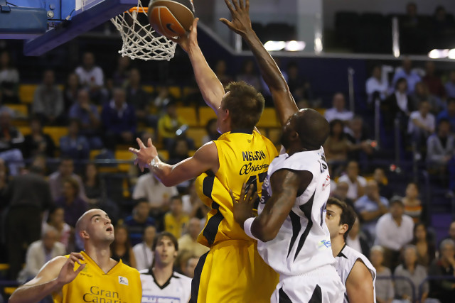 Tras un comienzo de partido trabado por ambos conjuntos; con imprecisiones y balones perdidos, el intercambio de canastas se sucedía en los primeros minutos de juego. Un igualado 8-8 se vio roto por un parcial 10-0 a favor del conjunto canario. Xavi Rey (10 puntos y 7 rebotes), Marquez Haynes (15 puntos) y Javier Beirán (19 puntos y 6 rebotes) fueron los artífices principales en el juego ofensivo del Gran Canaria 2014 acabando el primer cuarto con un claro 24-13. En los segundos 10 minutos que se iban a disputar, el intercambio de canastas no favorecía al conjunto visitante. El juego interior del Blu Sens Monbus hacía mucho daño en la pintura gran canaria, a pesar de que el dominio en el rebote era claramente amarillo. Oriol Junyent (9 puntos y 4 rebotes), Levon Kendall (6 puntos y 3 rebotes) tuvieron minutos finales de cuarto de calidad. El descanso estaba presidido por un claro 53-36.