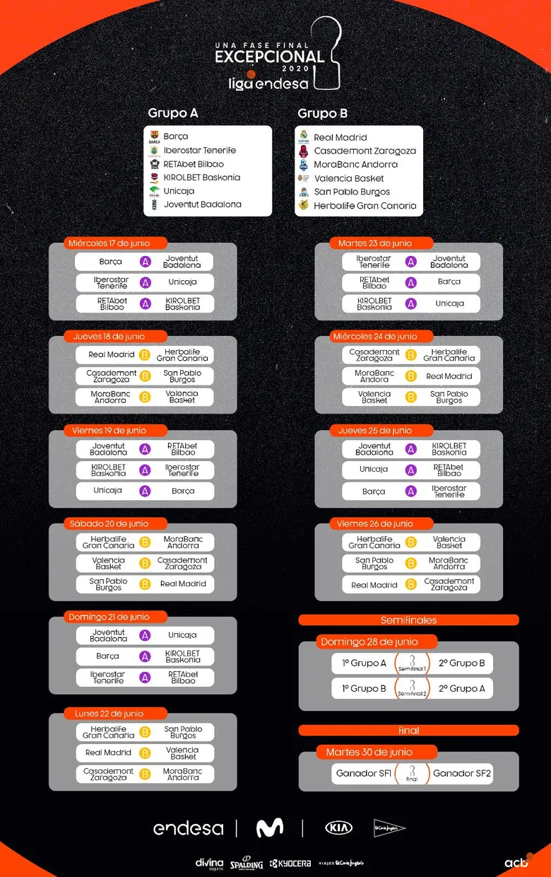 La fase final arrancará el miércoles 17 con los tres primeros partidos del Grupo A: Barça-Joventut Badalona, Iberostar Tenerife-Unicaja y RETAbet Bilbao-KIROLBET Baskonia. El jueves 18, estreno del Grupo B con los duelos Real Madrid-Herbalife Gran Canaria, Casademont Zaragoza-San Pablo Burgos y MoraBanc Andorra-Valencia Basket.