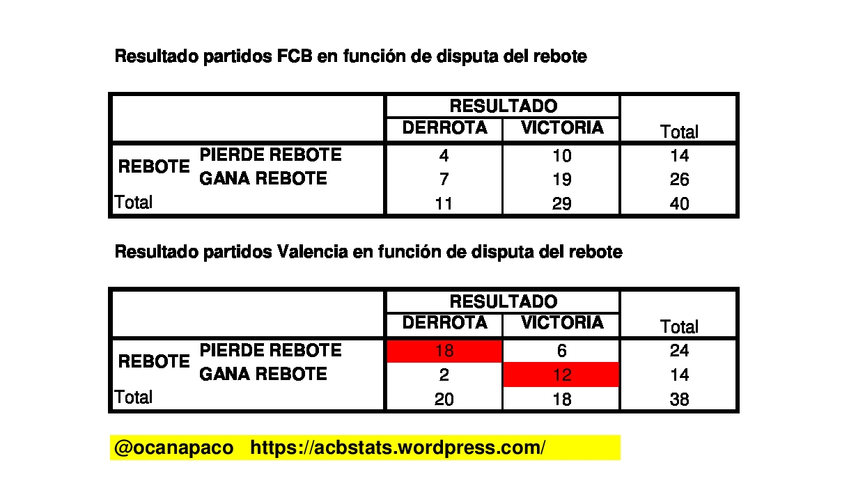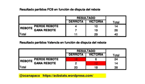 Aplicando el test estadístico citado anteriormente, la respuesta es negativa en el caso del FC Barcelona (el equipo de Xavi Pascual es capaz de ganar partidos con independencia del dominio del rebote), y positiva en el caso del Valencia Basket, equipo que ve condicionado sus resultados por el dominio del rebote: de hecho si gana el rebote se lleva el partido en el 85.71 % de las veces (12 de 14 veces).