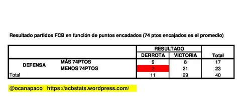 - El dominio del FC Barcelona de los partidos con poca anotación: Valencia Basket promedia en 38 partidos, 78.8 puntos, pero quizá (esto sólo es una hipótesis) baje en algo su anotación debido a que se enfrenta a la mejor defensa ACB. El FC Barcelona encaja únicamente 0.78 ptos por posesión en ACB, o sea, 100.78 puntos cada 100 posesiones, y para el global de n=40 partidos, le lleva a encajar un promedio de algo menos de 74 puntos. Estudiemos que ocurre con el FC Barcelona cuando sus rivales están por encima/debajo de su promedio defensivo: