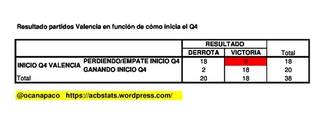 De 18 partidos que inició en empate/perdiendo el último cuarto, en ninguno de ellos fue capaz de ganar (sin embargo sí que perdió 2 partidos en los cuales inició en el último cuarto ganando). Este dato también es significativo.