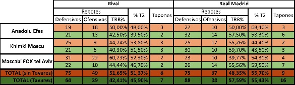 Pero si se quiere medir el efecto Tavares, es vital analizar su impacto sobre los rivales. En la siguiente tabla se puede analizar el impacto del gigante caboverdiano en rebotes, tiros de dos y tapones; comparando los duelos de Euroliga que ha tenído el Real Madrid frente al mismo rival en partidos antes de la llegada de Tavares (zona naranja), y con Edy en el equipo (zona verde).