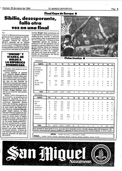 A pesar de ello, aquella temporada llegaría por primera vez a la final de la competición europea más importante: la Copa de Europa. La final se disputaría en Ginebra, entre el conjunto catalán y el Banco di Roma. Llegaba el equipo azulgrana como favorito, manteniendo el bloque de los últimos años en la línea exterior del equipo y con Starks y Davis, llegado ese mismo curso al club, como referentes interiores. Por otra lado, el conjunto italiano estaba dirigido por el entrenador Valerio Bianchini. Su plantilla estaba formada por una columna vertebral que integraban los jugadores transalpinos Stefano Sbarra, Marco Solfrini, Fulvio Polesello y Enrico Gilardi, además de los extranjeros Larry Wright (verdugo del Barcelona en aquella final), base y estrella del equipo, y el interior Clarence Kea, ambos con previa experiencia en la NBA.