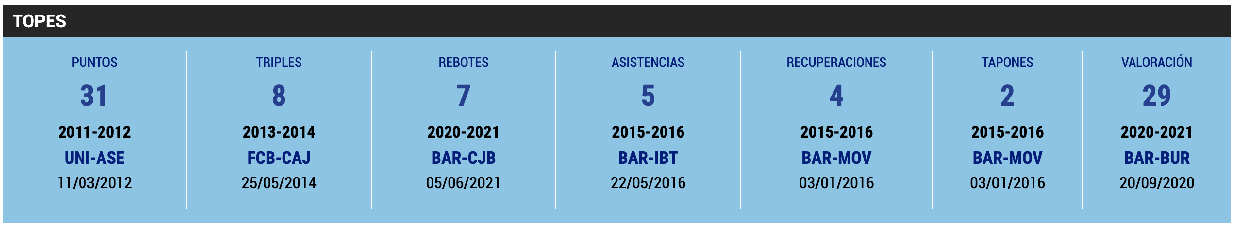 En este curso 2020/21, en el que el Barça ha conseguido el doblete, con Copa y Liga, Álex Abrines ha disputado 83 partidos, 62 de ellos como titular. Ha tenido una media de 7.8 puntos (65% en tiros de dos y 43,5% en triples) y 2.8 rebotes en 19 minutos por partido en la Liga Endesa y de 6.1 puntos (42% en triples) en 18 minutos en Europa.