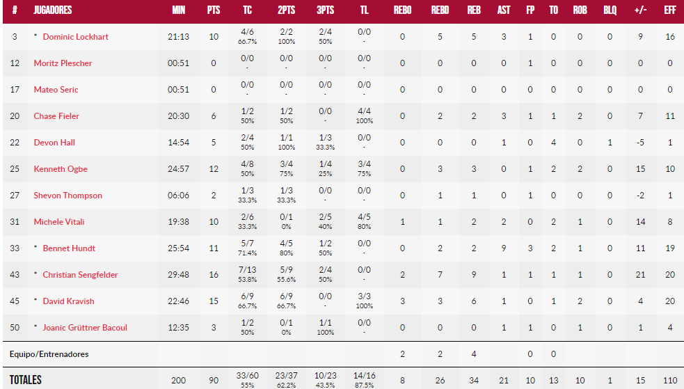 David Kravish fue el jugador más determinante del encuentro y aunque jugadores como Jenkins o Sengfelder le superasen en lo estadistico por lo mínimo, el interior americano fue sin duda una pesadilla para los hombres de negro y es que el jugador fue vital en la victoria de los suyos logrando acumular unos guarismos de 15 puntos y 6 rebotes.