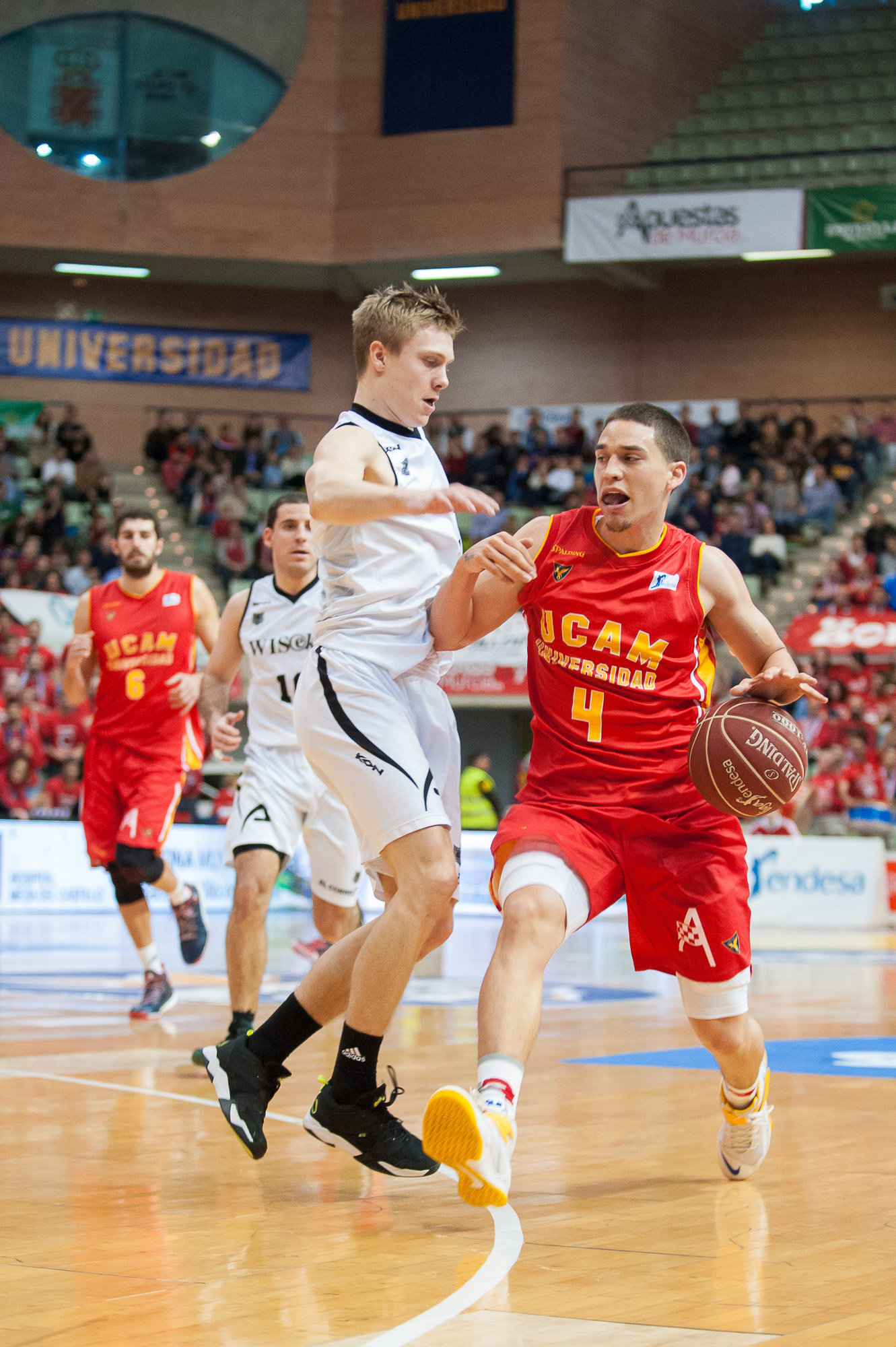 PARCIAL DE 20-0: Los pimentoneros empezaron el segundo cuarto arrollando, dos mas uno de Rojas para empezar, triples de Cabezas y Bamforth y todo mientras los visitantes pasaban más de siete minutos sin anotar, hasta que Mumbrú conseguía encestar a falta de 2:50 poniendo el 44-20 en el electrónico. Pero al UCAM le salía todo y hasta Lee se estrenó anotando en la Liga Endesa, por lo que la ventaja ascendió hasta el 52-28 con el que los equipos visitaban el vestuario.