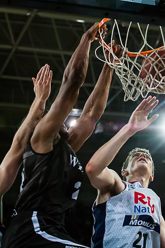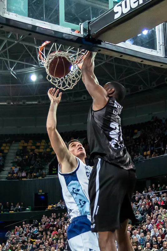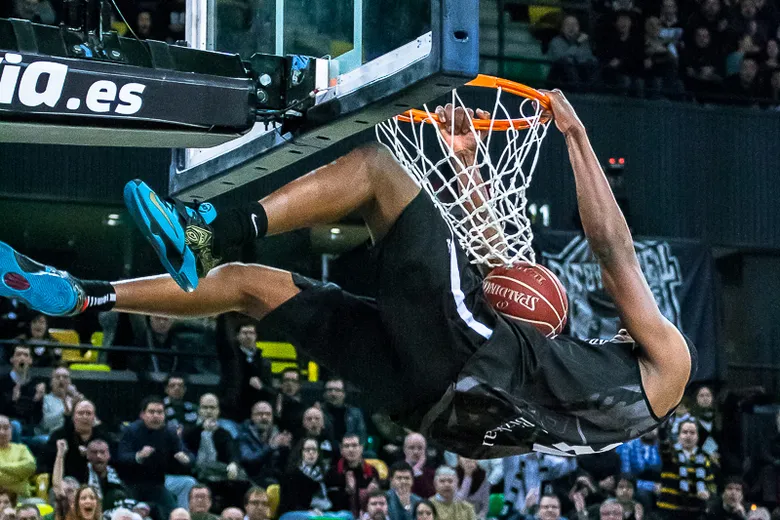 En el estreno del flamante nuevo patrocinador, Latavious Williams firmó otra de sus mejores actuaciones de la temporada. Se comió al juego interior de Gipuzkoa Basket, el poster norteamericano sumó 13 puntos y 11 rebotes. En la siguiente sucesión de imágenes, Williams machaca la canasta ante la presencia de Goran Huskic.