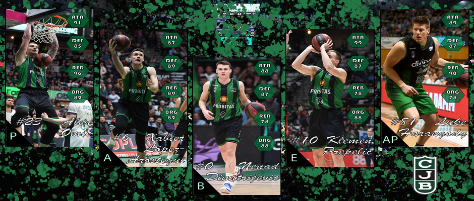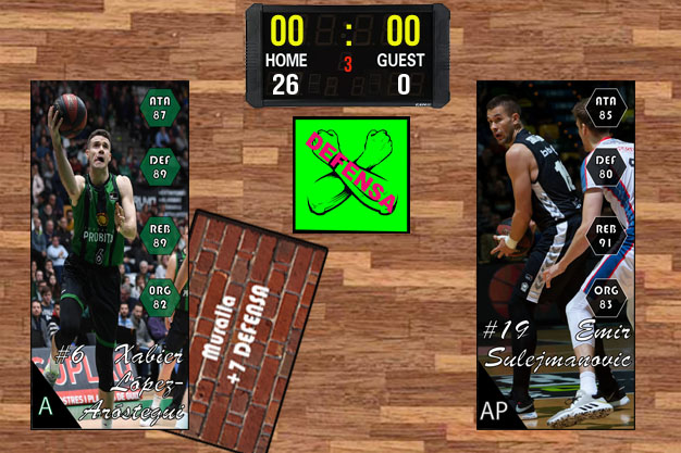 Balón al aire y comienza un partido que tendrá como protagonista del primer cuarto al ataque. Los verdinegros salen de inicio con su gran estrella Klemen Prepelic (99 en Ataque) mientras que los hombres de negro utilizan al joven Arnaldas Kulboka (88 en Ataque) y emplean la carta de Apoyo ON FIRE para mejorar sus prestaciones (88 + 7 = 95). Un cuarto con dos auténticos anotadores que se acaba decantando del lado de la balanza del escolta esloveno por 4 puntos (99 – 95 = 4).