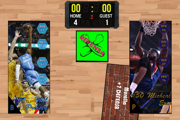 Pasamos de mirar el aro a cerrarlo. Toca defender y Javier Zamora introduce en el parquet a Phil Pressey (93 en Defensa) mientras que Dusko Ivanovic introduce a Micheal Eric (87 en Defensa) y utiliza la carta de Apoyo MURALLA (87 + 7 = 964). El cuarto es para los baskonistas por 1 punto (93 – 94 = 1) sumando sus primeros dígitos en el electrónico y situándose a tres puntos de los colegiales al descanso (4 – 1).