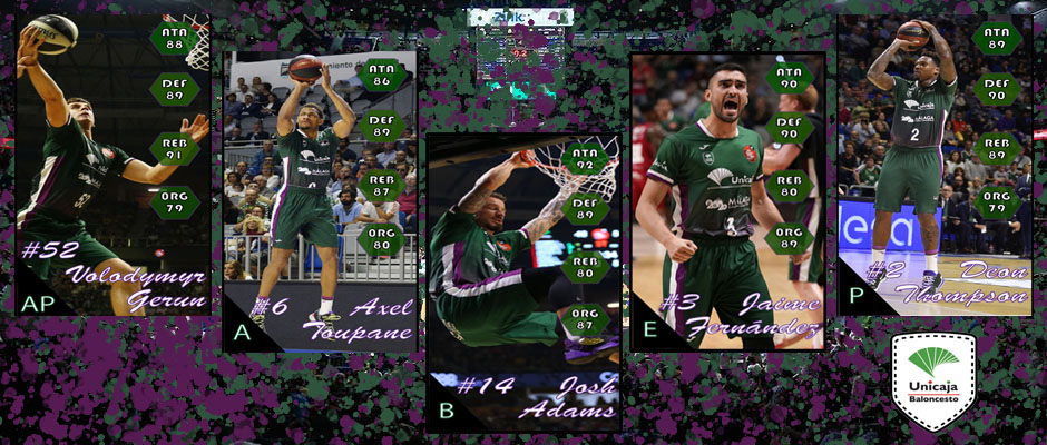 Unicaja Málaga sale de inicio con “mister muelles” Josh Adams como base, talento español en el puesto de escolta con Jaime Fernández, Axel Toupane como alero, el gladiador de Volodymyr Gerun en el puesto de cuatro y Deon Thompson como pívot. Kirolbet Baskonia jugará con Pierria Henry como base, Matt Janning en el puesto de escolta, Shavon Shileds como alero, su gran estrella Tornike Shengelia como ala-pívots y Micheal Eric como cinco. Luis Casimiro apuesta por ON FIRE y PIZARRA como sus cartas de Apoyo. Dusko Ivanovic elige IMÁN y PIZARRA como sus cartas de Apoyo. ¡Empecemos!1º CUARTO: REBOTE