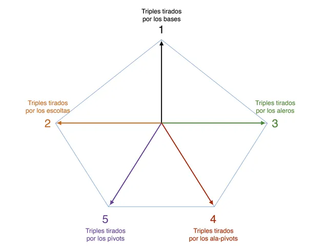 La muestra de datos de este artículo compara las estadísticas de los equipos ACB en esta temporada 2016-2017 con la temporada 2004-2005. Los datos a plasmar son los promedios de triples que lanzan los jugadores de un equipo, separados por posiciones (bases, escoltas, aleros, ala-pívots y pívots). Por ejemplo, en el Manresa, entre los bases (Machado, Cvetkovic y Costa) lanzan 7’5 triples y entre los escoltas (Suggs y Aranitovic) 9’4, así que el promedio de tiros triples de los bases del Manresa es de 2’5 (7’5/3) y el de los escoltas 4’7 (9’4/2). Para mostrar estos datos, se mostrará una visualización pentagonal, donde cada vector desde el centro hacia los vértices indica el número de triples por posición, tal y como se muestra en la Figura 1. Esto quiere decir que como más cerca del vértice, mayor es la cantidad de triples lanzados.