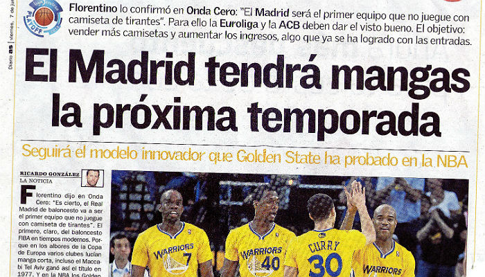 Hace tres meses, el viernes 7 de junio pasado, leía sorprendido en el periódico AS, a toda plana, la sorprendente noticia de que el Real Madrid iba a vestir en esta temporada nueva indumentaria en su sección de basket, adoptando camisetas con mangas, y poniendo como modelo a adoptar, el atuendo que los Golden State habían probado en la NBA. Cuya noticia era refrendada por don Florentino Pérez, presidente del Real Madrid, al puntualizar “El Madrid será el primer equipo que no juegue con camiseta de tirantes” que equivalía a decir que sería el pionero en España a jugar con mangas.