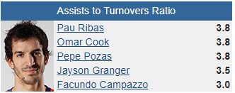 El base-escolta catalán es un jugador tremendamente seguro y con gran capacidad de pase, lo que le lleva a liderar una clasificación que dominan los bases puros. También llama la atención la buena clasificación de Facundo Campazzo, base imaginativo que arriesga mucho en su juego, cuando en esta estadística suelen dominar bases que priman más el cuidado del balón como Cook o Pozas.