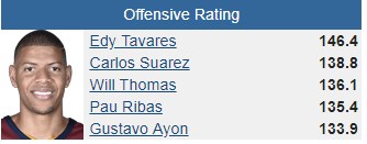 Walter Tavares es el rey en este apartado. El gigante caboverdiano del Real Madrid es el jugador que mayor diferencia a favor tiene entre la eficiencia ofensiva y la defensiva con 46’4 puntos a sus favor. Este sería el top 5: