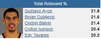 El porcentaje de rebotes es una estadística muy interesante ya que no solo mide el impacto en función del tiempo en cancha sino que muestra el número de rebotes que coge un jugador en función de los rebotes que hay mientras está en pista. Realmente es la estadística más fiable para usar el adjetivo de “dominador del rebote”. El Titán de Nayarit no está ni siquiera entre los quince primeros en la media de rebotes por partido, en la que si está su compañero Eddy Tavares (4º), pero si hay alguien en el Real Madrid y en toda la ACB que asegura en mayor porcentaje que el rebote será para los blancos, ese es Gustavo Ayón.