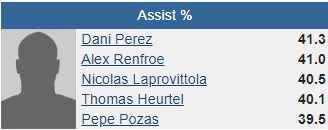 El porcentaje de asistencias sin embargo es una estadística un poco diferente, ya que podría decirse que mide más la importancia pasadora de un jugador dentro del equipo, ya que mide el porcentaje de asistencias de un jugador sobre las que da el equipo. Es decir que también podría medir que los compañeros no se prodigan en ese apartado. Pero muestra la importancia de un jugador en una faceta clave, al estilo del USG que veremos después. No hay grandes sorpresas, ya que todos son jugadores que están bien clasificados en asistencias por partido, pero como detalles curiosos vemos que Dani Pérez es aún más importante en la dirección para su equipo que Laprovittola o que Pepe Pozas da menos asistencias por partido que Sabàt pero es más en cuanto al porcentaje.