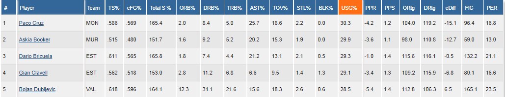 El USG% mide el volumen de jugadas finalizadas por un jugador con tiro de campo intentando, tiros libres intentados o pérdida de balón. Esta estadística nos dice a que jugador busca más su equipo y quien tiene más importancia y balón en la ofensiva. Paco Cruz domina esta estadística a pesar de que solo es el jugador número doce en cuanto a puntos anotados con 13’3, pero aquí hay que valorar que es uno de los valores seguros dentro de la convulsa temporada de Montakit Fuenlabrada y que la lesión de Popovic ha hecho que el peso del ataque recaiga sobre él. También vemos que Brizuela se ha ganado ser el jugador al que más busca su equipo y es uno de los factores de que sea el máximo anotador de la liga, que Clavell no es “tímido”, que Booker es un tirador y no un director, y que Valencia, aunque sea el tercer equipo que más tira de tres, busca a su interior estrella.