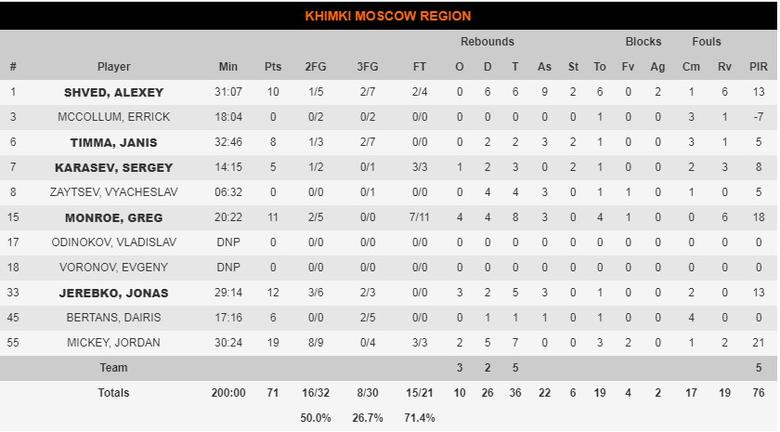 Khimki se llevó la derrota por las 19 perdidas y por su falta de acierto exterior (8 de 30 en triples). Shved y Timma no tuvieron su día y sumaron 4 de 14. Los interiores rusos fueron los que los mantuvieron en el partido con un gran trabajo de Jordan Mickey (21 de valoración), Monroe (18) y Jerebko (13).