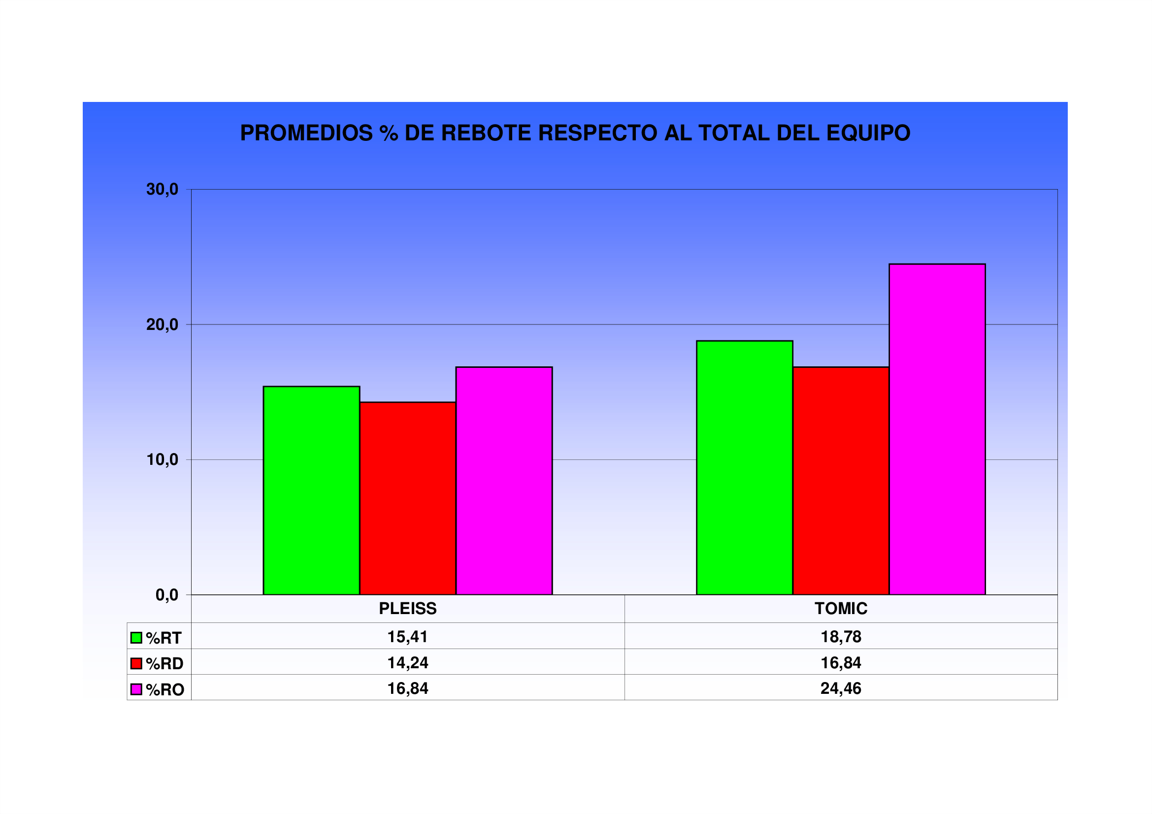 Tal y como se deduce del gráfico, los promedios de % de rebote total y de rebote defensivos son similares entre ambos jugadores, no ocurriendo esto con el promedio de % de rebote ofensivo, ya que Tomic captura de media el 24.46% de los RO del FCB, y Pleiss, únicamente el 16.84% de los RO del Caja Laboral.