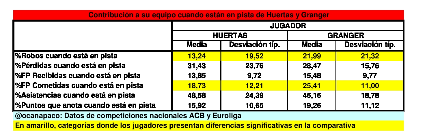 En el caso de Huertas y Granger, a partir del test estadístico que se ha hecho con los valores promedios de esos índices RSG Of, y RSG Def, (ver la parte inferior de la tercera de las tablas), puede concluirse que la principal diferencia entre ambos jugadores es la aportación defensiva, y no tanto la ofensiva, donde incluso Huertas aún presentando menor valoración de RSG Of (10.14 frente a 11.46), rinde con más regularidad que Granger (el valor de su desviación típica es sensiblemente inferior, 6.90 frente a 9.82).