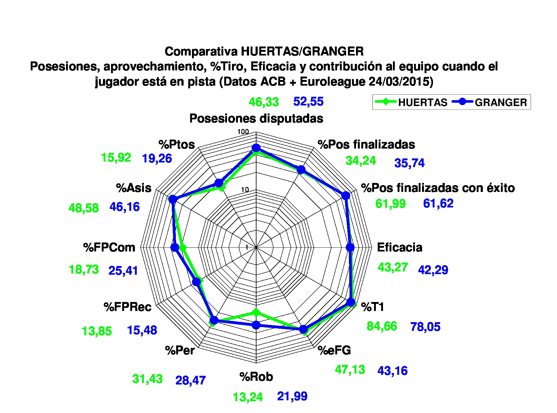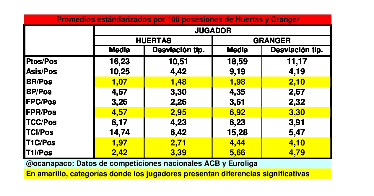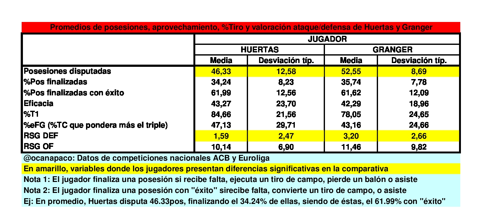 Nota: Indicar (ver tecera tabla, ó gráfico), que en promedio Granger juega algo más que Huertas (52.55 posesiones de media frente a 46.33).