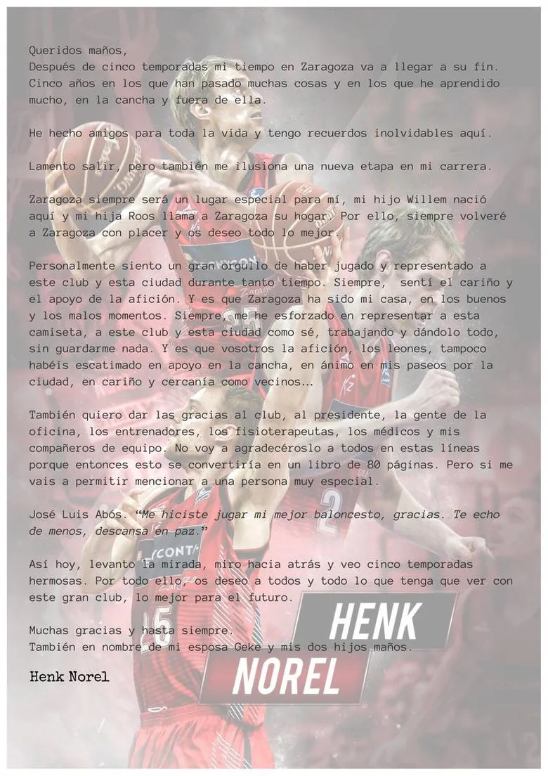 Tecnyconta Zaragoza no renovará el contrato de Henk Norel (29 años/2.12m) y pone fin, de esta manera, a una relación de 5 temporadas con el pívot holandés que la última temporada ha promediado 10.2 puntos, 6.2 rebotes, 1.1 asistencias y 13.3 de valoración en 23 minutos por partido.