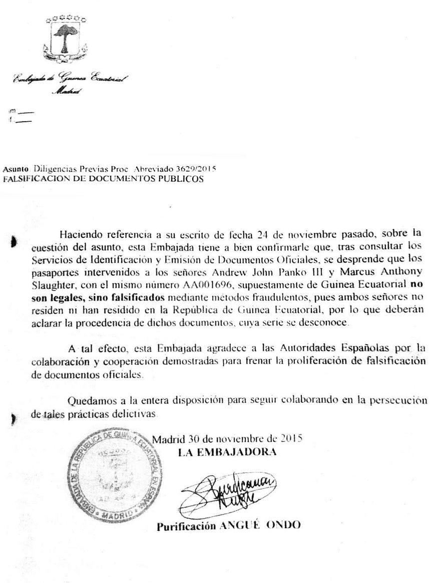 Este diario ha podido acceder a la carta que, a requerimiento del juez, envió la Embajadora de Guinea informando que los pasaportes de Marcus Slaughter y Andy Panko (cuya pasaporte de Guinea Ecuatorial también es investigado pero cuya ficha cotonou no fue nunca tramitada por Fuenlabrada) “no son legales, sino falsificados mediante métodos fraudulentos”. Los documentos de ambos jugadores estaban expedidos en el Consulado de Guinea Ecuatorial de Las Palmas de Gran Canaria, una circunstancia sorprendente teniendo en cuenta que tanto Panko como Slaughter convivían en Madrid y es ahí donde se ubica la Embajada de aquel país.