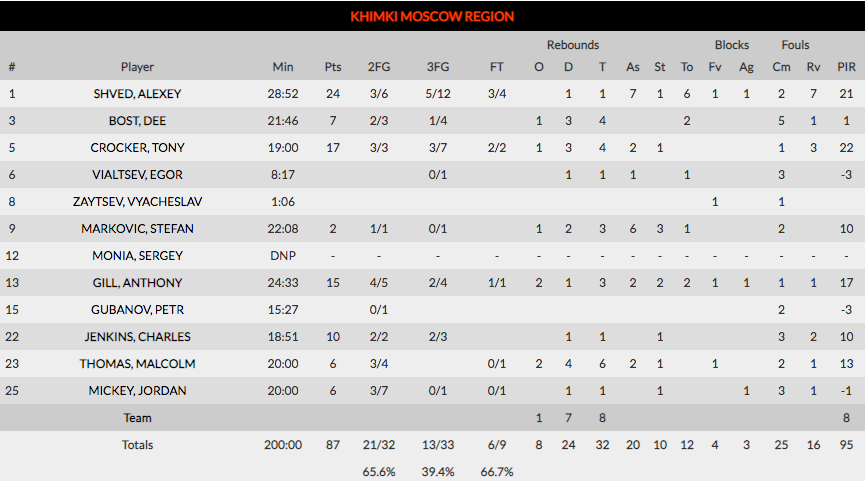 Shved: El escolta ruso salió determinado a que su equipo lograra la primera victoria en la competición europea y desde el primer minuto fue decisivo. Con grandes porcentajes de tiro y capacidad para encontrar socios en mejor posición, Shved también generó buenos tiros para sus compañeros. Acabó en sus medias de la temporada, con 24 puntos y 7 asistencias, siendo decisivo en los momentos importantes. Con el partido decidido muy pronto, Gill y Crocker se unieron a Shved para no dar ninguna opción a su rival.