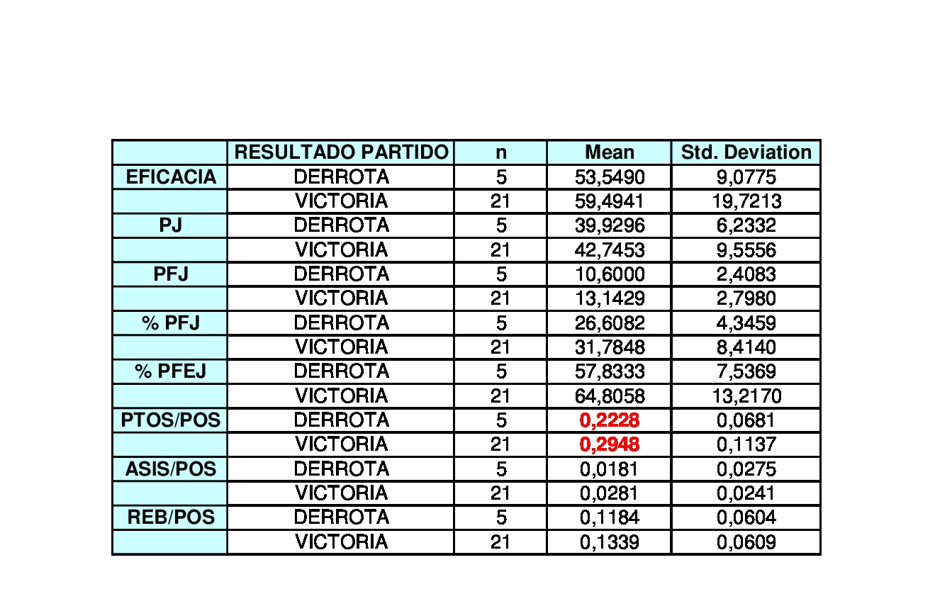 Se puede deducir, que no hay grandes variaciones en cuanto al rendimiento del colectivo en función de si el jugador goza o no de la confianza del entrenador (juegue o no más de 15 minutos). Únicamente, parece crecer en promedio el %Rebote ofensivo, circunstancia que es postiva para su equipo.