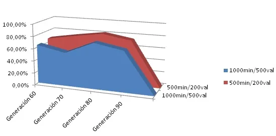 Como pueden apreciar, las generaciones del 80 disponen de las cifras más altas y con diferencia, siendo casi un 82% que jugando 500 minutos obtengan mínimo 200 de valoración y con 75% cuando la distribución es 500val/1000min. Parece que tiene sentido ya que este grupo de jugadores son los que han sustentando a la selección absoluta en los últimos años y que actualmente siguen siendo la principal referencia del baloncesto español.