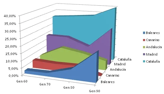 En el anterior gráfico, tenemos en cuenta a las autonomías con mayor número de jugadores. Los porcentajes han cambiado con respecto al de los debutantes. Las comunidades más fuertes tienen un mayor protagonismo, siendo Cataluña y Madrid las más influyentes y suponiendo el 48% del total con las generaciones del 60, hasta el 66% con las más recientes.