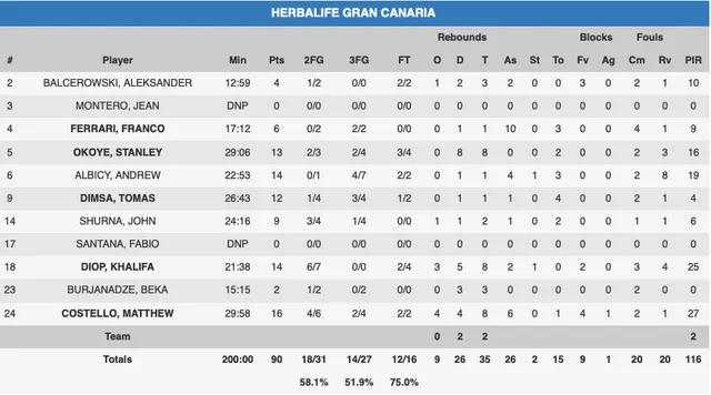 El mejor partido del pívot senegalés en su carrera, afianzando sus buenas actuaciones en los últimos partidos y dando a su equipo lo que más necesita. Puntos bajo canasta, rebotes e intimidación es lo que ofrece el africano, que ha aprovechado la falta de centímetros en la rotación canaria para dar un paso adelante y ser importante. Sus números evidencian la vital aportación de Diop, con 25 créditos de valoración y 14 puntos, 8 rebotes más 2 tapones y dos asistencias.