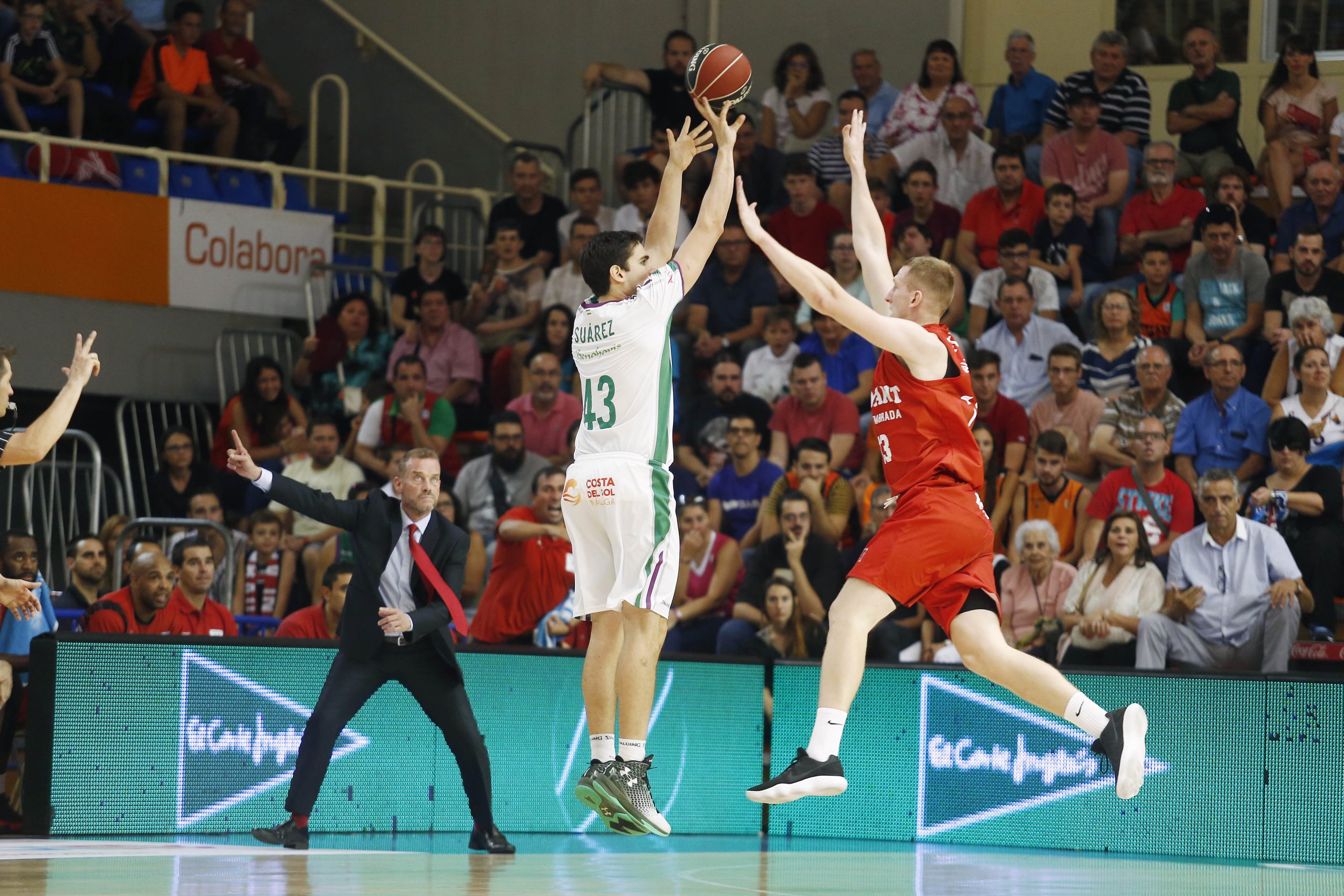 Con todos sus particularidades propias (Alberto Díaz volvía a la que fue su casa durante un infausto año en el que, sin embargo, dejó buen recuerdo a la afición fuenlabreña; Christian Eyenga se enfrentaba a los que fueron sus compañeros hace tan sólo unos meses, por un breve pero intenso período de tiempo), llegaban a este duelo en la tercera jornada dos equipos que mantenían su casillero de derrotas inmaculado. Destacaba en especial el de un Unicaja que había conseguido escalar hasta el primer puesto la tabla hasta que ayer Herbalife Gran Canaria, en su partido adelantado, le arrebatara el liderato. En un arranque de intercambio de golpes, con ritmo, tanto Fuenlabrada, que arrancó con un 4-0 inicial, como Unicaja, que levantó esa desventaja hasta una igual renta máxima (8-12), pudieron mostrar sus virtudes ofensivas y dar buena cuenta del igualado duelo que le esperaba a la afición del Fernando Martín. Fuenlabrada conseguía levantar ese 8-12 con dos triples consecutivos de Christian Eyenga que levantaron la primera gran ovación de la grada local y a partir de los cuales Fuenlabrada no volvería a situarse jamás por detrás en el marcador.