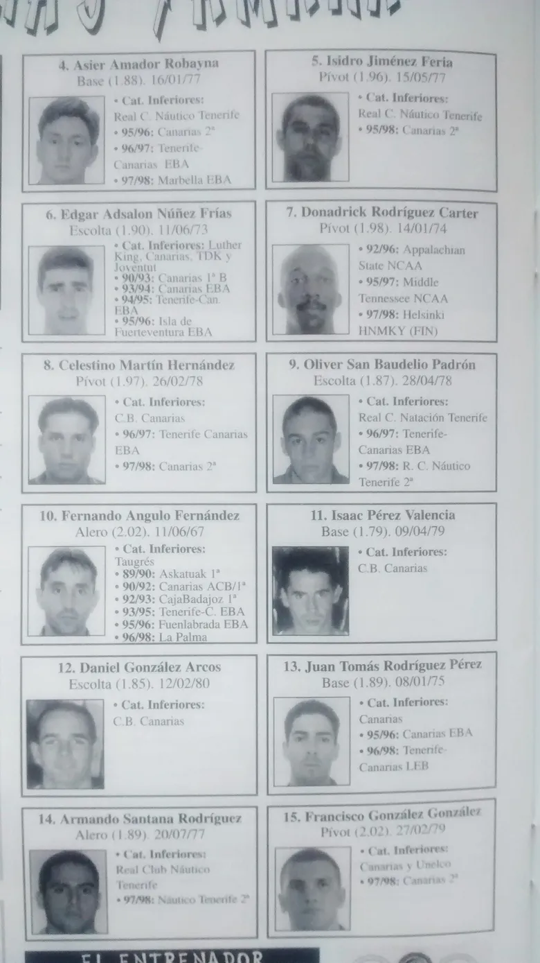 En la imagen el equipo que consiguió el ascenso de la primera autonómica a liga EBA (1997/1998). . Entrenadores: Jou Costa, Pocho Jerez y Pedro Bacallado, jugadores: Edgar Núñez, Isidro Jiménez, Benito Cabello, Israel Martín, Victor Thovar, Henry Jorge, Celestino Martín, Fran González, Armando Santana, Guillermo Cubas, Pedro Pérez, Márquez, Izquierdo o Isaac, mientras que como juniors estaban Airam Marrero o Dani González.