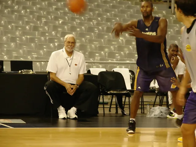 Por la mañana los Lakers se han entrenado en el Palau Sant Jordi con la presencia de los medios de comunicación para tratar de acoplar a los cinco nuevos jugadores que han llegado esta temporada al equipo de la ciudad californiana. Ni Gasol ni Bryant se han ejercitado aunque está previsto que ambas estrellas tengan algunos minutos para que los aficionados puedan disfrutar de su talento. En los 30 escasos minutos que ha durado la sesión se ha podido ver el carisma del señor de los anillos, Phil Jackson, dirigiendo el 5×5 desde el banquillo a toque de silbato y corrigiendo una y otra vez las variantes del triángulo ofensivo de Tex Winter. El susto lo ha dado el rookie Derrick Caracter tras lesionarse en un tobillo aunque ha acabado la sesión con el resto de sus compañeros. Precisamente Caracter es uno de los que mejores impresiones ha dejado en la sesión de hoy recibiendo muchos balones en el poste medio y distribuyendo el juego desde esta posición. Sorprendía ver de cerca la habilidad de Lamar Odom para subir el balón como un base, lanzar como un alero y rebotear como un pívot o los cuerpos totalmente tatuados de Matt Barnes o Ron Artest.