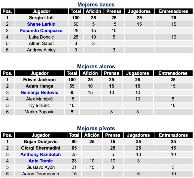 Ya se conocen a los componentes de los dos mejores quintetos de esta Liga Endesa. Así han quedado las votaciones finales en las que participaron jugadores, entrenadores, prensa y afición. Llull y Jackson han sido los únicos jugadores escogidos por unanimidad, mientras que Campazzo obtuvo la misma puntuación que Luka Doncic, pero el tope de valoración en una categoría única (afición) premió al argentino.