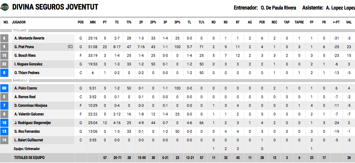 Un parcial de 10-0 para comenzar el partido, provocaba el primer tiempo muerto por parte del Joventut. Los jugadores de Badalona supieron responder de la mano Gerard Prat y Adria Monterde para devolver el parcial con un 10-4 (14-10). Después de un gran movimiento de balón, Arnau Valentin metía un triple para acerca a los suyos a tan solo un punto. Nuñez (18 puntos, 4 rebotes y 4 asistencias al final del partido), Ddiaye (15 puntos en 16 minutos y el pequeño de los Garbuba, tiraban del gran juego colectivo para anotar cada uno un total de 6 puntos, y permitiendo que su equipo se marchara con 26 puntos al término del primer cuarto (26-15).