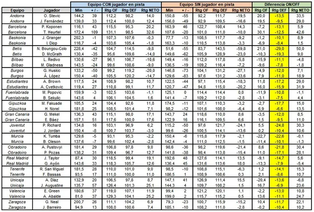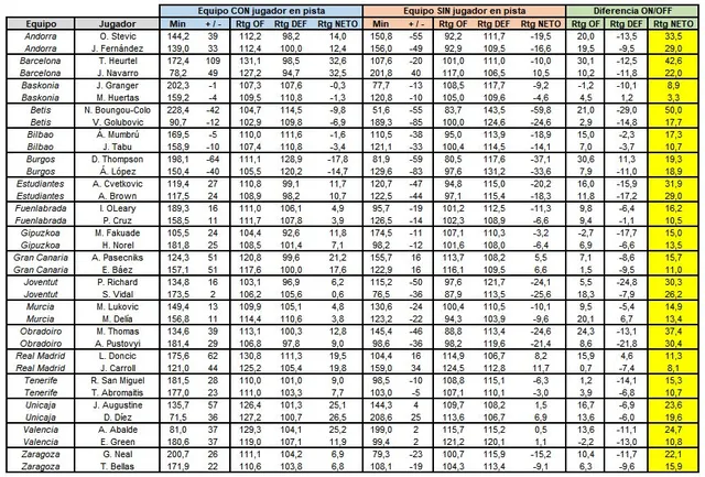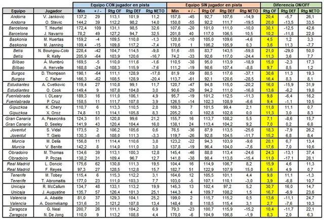 También la estadística de los dos jugadores con mayor diferencia en el Rating Ofensivo nos muestra datos interesantes, y no solo a nivel de ataque, si no que nos hacen ver más números defensivos: