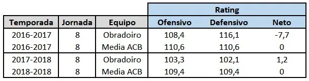 La temporada pasada el Obra comenzó mal la temporada con unos resultados tras 8 jornadas justo al revés que en la actual: 2 ganados y 6 perdidos. Su ataque era más productivo, ya que promediaba 108,4 puntos por cada 100 posesiones, mientras que el de este año es de 103'3, pero el porcentaje defensivo era mucho peor con 116,1 puntos encajados de ratio, mientras que el de este año es de 102,1. Es una mejora realmente espectacular ya que se reduce en 14 puntos encajados por cada centena de posesiones. Esto además permite equilibrar su juego, teniendo un rating neto de +1'2 cuando el año pasado era de -7'7. Este dato ya justifica significativamente el gran inicio que ha supuesto su mejor arranque histórico.