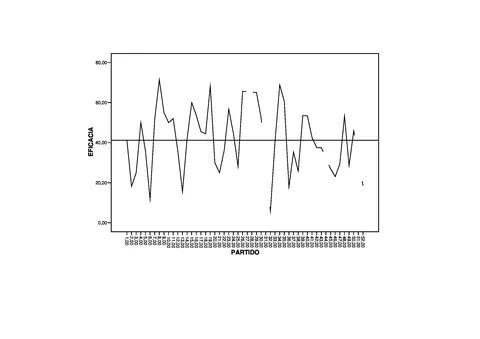 - Eficacia del jugador, entendida como el cociente entre puntos anotados y puntos potencialmente anotados según los tiros efectuados (efectividad promedio de 41.17%).
