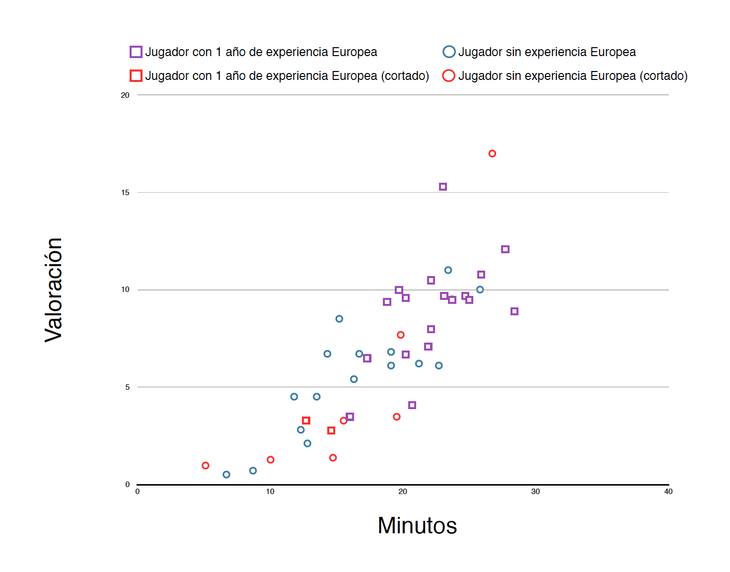 El problema del anterior gráfico es que el rendimiento de los jugadores no se ve plasmado, así que en el Gráfico 2, se puede visualizar una comparativa de las estadísticas de todos los rookies que han pasado por la Liga Endesa en los últimos tres años. Para simplificar, la comparación está hecha en base a los valoración/minutos jugados del jugador, pues son las cuantificaciones que mejor ejemplifican el rendimiento (se podrían dar excepciones como especialistas en el triple, cuya influencia va más allá de la valoración, pero son casos aislados). En este gráfico, las estadísticas de los jugadores sin experiencia europea están marcados con un círculo azul, y la de los jugadores con un año de experiencia, con un cuadrado violeta. Los jugadores que fueron cortados a media temporada también están diferenciados, en este caso con el color rojo en su correspondiente símbolo.