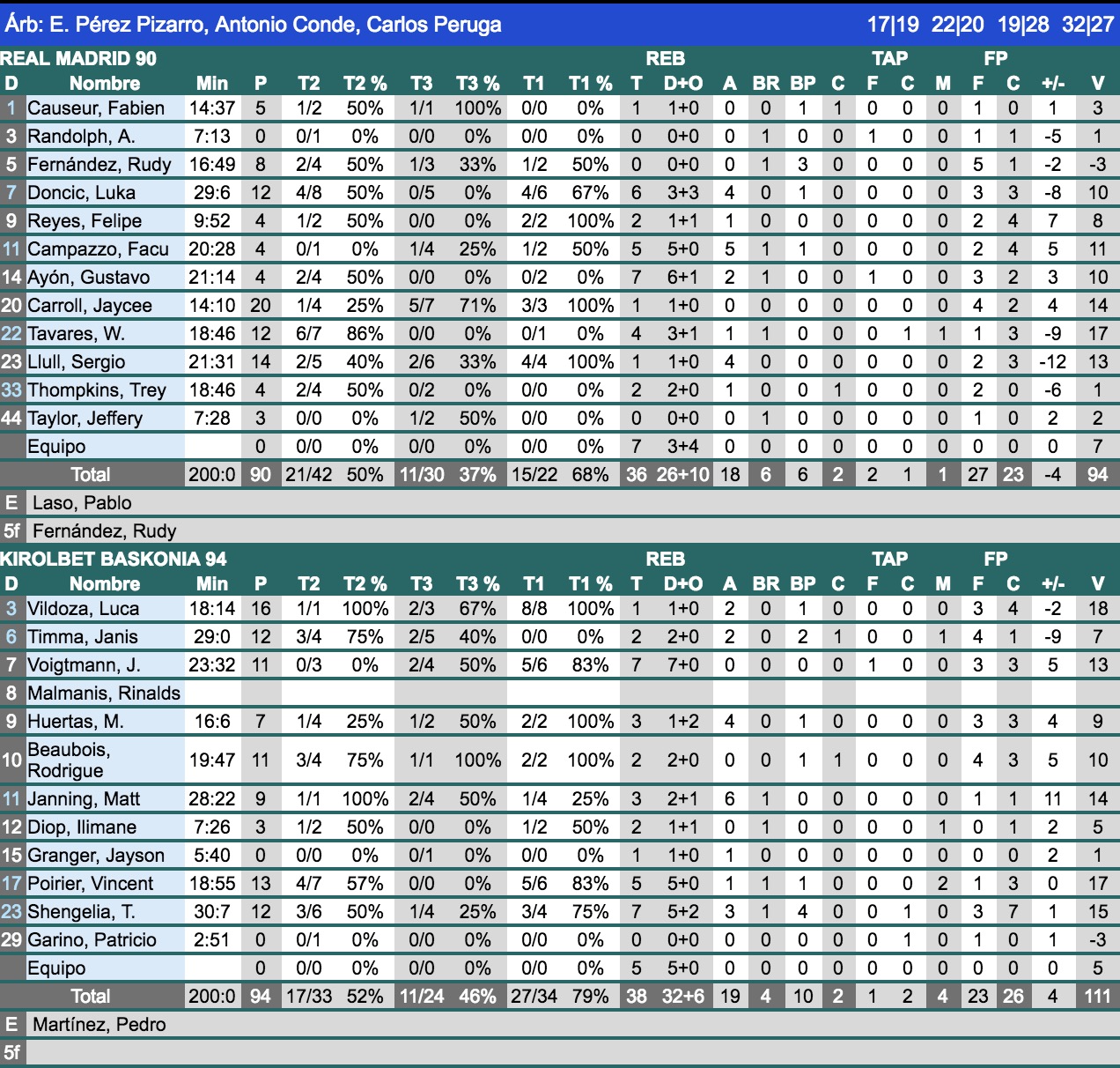 La final arrancó con unos intensísimos minutos focalizados en el duelo argentino entre Campazzo y Vildoza. Los playmakers marcaron un ritmo endiablado en los primeros compases, en los que ninguno de los dos equipos conseguía despegarse. Parecía que era Edy Tavares quien desequilibraría la balanza, pero entonces apareció Jannis Timma con 7 puntos casi consecutivos que daban a Baskonia una ventaja que duraría muchos más minutos de lo previsto (10-14, min. 7). Tardó más de ocho Pablo Laso en hacer sus primeros cambios casi forzados ante los evidentes síntomas de agotamiento de sus jugadores. A pesar de contar con Tavares como claro referente interior, con unos minutos escandalosos (8 puntos sin fallo, 3 rebotes), el Madrid no encontraba el equilibrio desde fuera (1/7 en triples) y tampoco podía agarrarse a la “vía Doncic”, desactivado durante el primer cuarto. Al final, un 17-19 para Baskonia.
