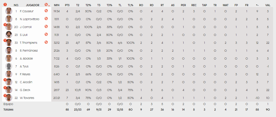 El partido del Real Madrid fue muy completo, pero como hemos comentado, un aspecto muy destacable es la zona de la pintura. Y ahí los que mejor se han movido son Trey Thompkins y Gabriel Deck, ambos los jugadores más valorados del día de hoy. Cuesta escoger entre los dos, porque han formado la pareja perfecta ante un Tavares que salía desde el banquillo. Deck fue el que primero destacó, siendo el gran nombre de la primera parte, y que acabaría con 23 puntos y 6 rebotes para 22 de valoración. Por su parte, Trey Thompkins cogió el timón en la segunda mitad, y terminaría firmando 23 puntos y 4 rebotes.
