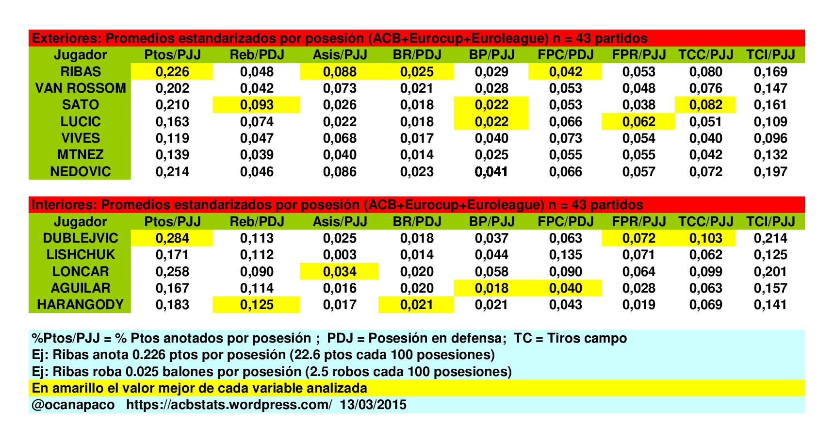 Transcurridos ya más de 40 partidos para ambos equipos en competición oficial en esta temporada 14-15, vamos a analizar cómo están rindiendo los jugadores de los actuales campeones de Liga ACB, y de la Eurocup, FC Barcelona y Valencia Basket, respectivamente.