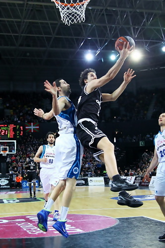 El partido tuvo un inicio un tanto frío, donde imperó el intercambio de canastas con Kostas Vasileiadis (9 puntos en el 1º periodo) y Andy Panko (10 puntos en el 1º periodo) como principales ejecutores. Las cosas se animaron en el 2º periodo. Los artilleros de ambos equipos sacaron sus muñecas a pasear para ir bombardeando las canastas rivales. Y en ese juego tenía ventaja Lagun Aro GBC con un Jimmy Baron (11 puntos en estos segundos 10 minutos) capaz de anotar triples indefendibles desde 8 metros. De esta forma, Lagun Aro GBC lograba una máxima diferencia de 8 puntos cerca del descanso después de un 2+1 de Ogide (30-38, min. 17). El tiempo muerto solicitado por Fotis Katsikaris sirvió para que los de casa cerraran la vía de agua. Por fin le llegaban balones a Marko Banic y Alex Mumbrú sacaba tajada al poste. El resultado se apretaba y al descanso se llegaba con un ajustado 40-42.