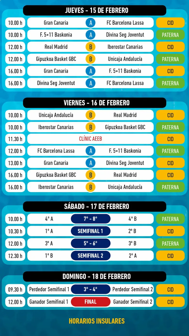 Los partidos se jugarán en el Centro Insular de Deportes y el Polideportivo La Paterna, con entrada gratuita para todos los asistentes, y en ellos se acogerá a los mayores talentos que se forman en las canteras de los clubes ACB en categoría infantil y que tratarán de seguir los pasos de los 58 jugadores que ya han debutado en la Liga Endesa tras su participación en la Minicopa Endesa.