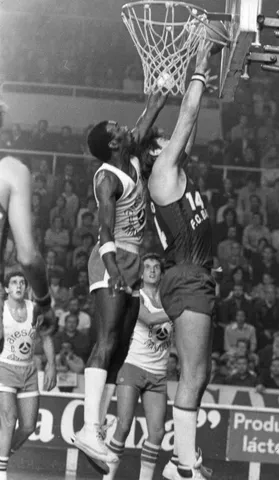 Sin embargo, no nos olvidemos del otro gigante de aquel año: el F.C. Barcelona. Un equipo muy fuerte. Con Epi y Sibilio como ametralladoras principales y Creus como jefe encargado de dirigir el equipo. Tenían mucha calidad, por lo que eran muy difíciles de parar. Otros jugadores importantísimos para el equipo eran Flores, un jugador fuerte y muy buen defensor,. Ssu base tirador, Solozábal, y un buen alero llamado Ansa. Como pívots tenían a Juan De la Cruz, un jugador alto con largos brazos. Era como una araña. Podía jugar de pivotpívot o de ala-pívot… incluso marcar a un alero rápido. Me acuerdo perfectamente cuando jugaba contra ellos. Cuando me marcaba Juan, no podía ver el aro, y cuando me marcaba Flores, me dolía el cuerpo de los golpes que me daba. Miguel Tarín también era un pívot ágil a pesar de ser el más alto de la Lliga (2.17). Junto a él, el extranjero Hanson, un pívot fuerte que cogía muchos rebotes. Eran rival directo del Real Madrid;, de hecho, les batieron en la final de la Copa del Rey en Badajoz”.