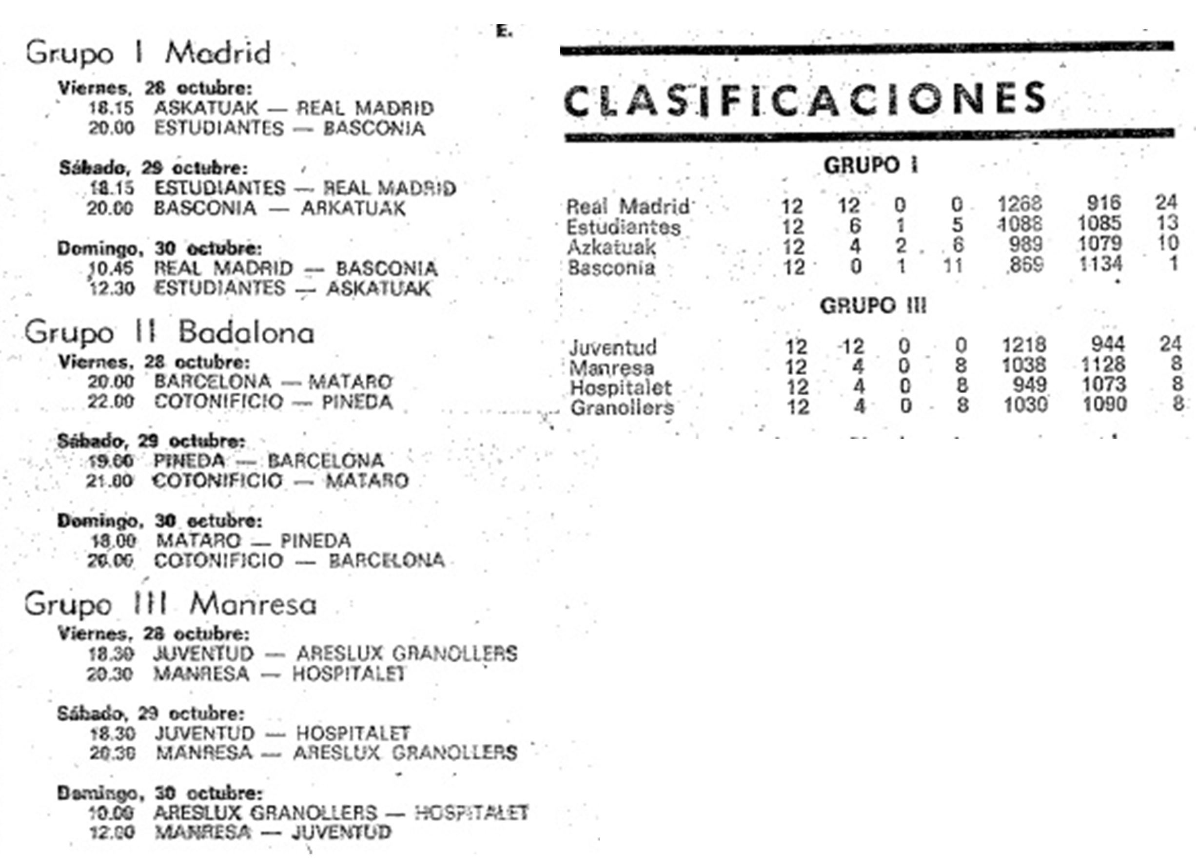 Quizá lo que habría que aclarar, para situar al lector que pueda guardar alguna duda sobre la veracidad de lo dicho es el momento en que se consiguen dichas victorias. El quid de la cuestión está en la Copa del Rey, o más concretamente en el formato en el que se disputaba la misma. Esto es, una liguilla previa en la que los doce equipos de Liga Nacional se dividían en tres grupos de cuatro, disputando partidos entre sí en sede única durante el fin de semana (ver foto al final del artículo). De esta manera, el Juventut pudo encadenar hasta 12 triunfos antes de llegar a la fase final, momento en el que ya había sido derrotado por el Real Madrid, pues se disputó en el mes de Mayo.