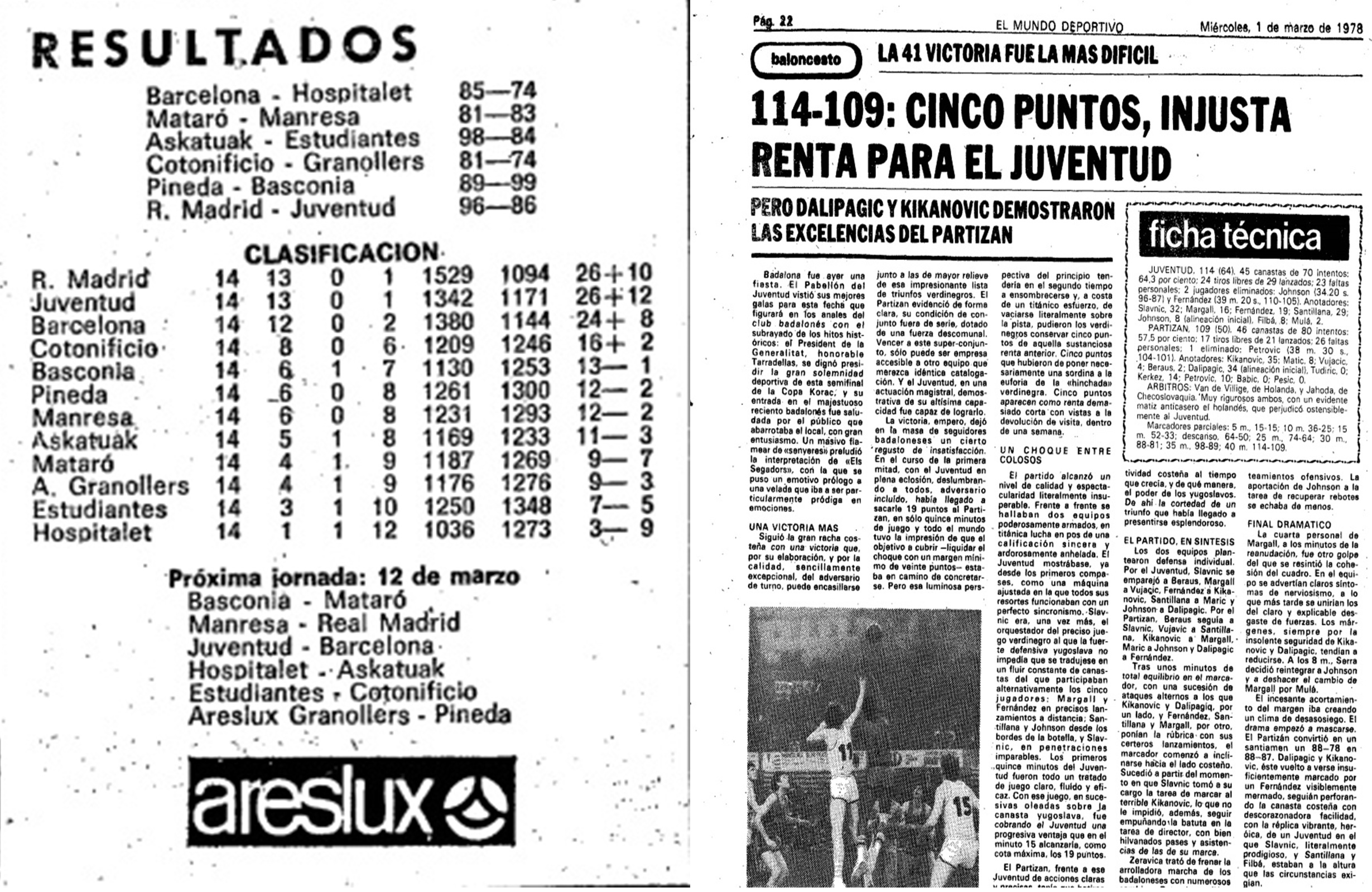 Escribía Juan Antonio Casanova en 'La Vanguardia' que el récord de victorias en el baloncesto nacional, al contrario de lo que se está diciendo en las últimas fechas, no pertenecía al Real Madrid de Ferrándiz, ni lo hace ahora el Madrid de Laso. Contrariamente a lo que se podía pensar, el récord lo posee el Juventut de Badalona, que consiguió encadenar 41 victorias, 34 de ellas oficiales, en la temporada 1977-78 en las tres competiciones oficiales que disputó aquel año: Liga, Copa del Rey y Copa Korac.
