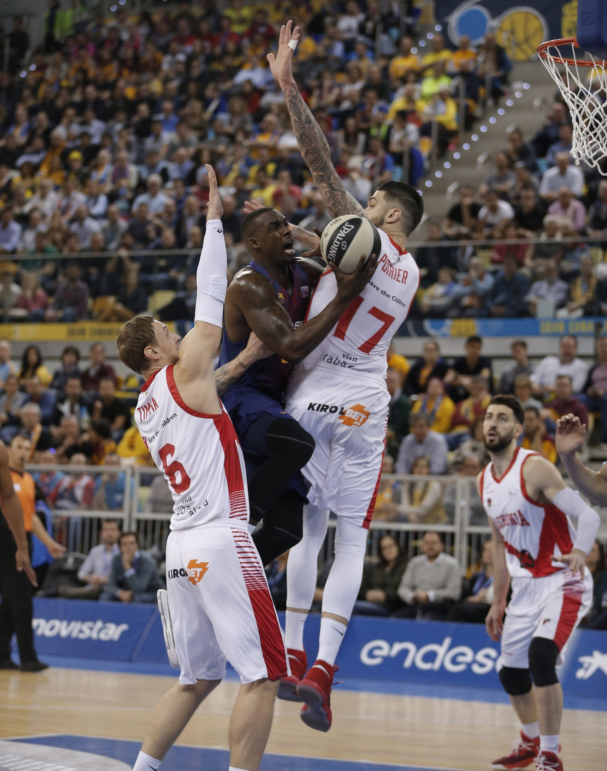 Dominio de Baskonia en los primeros compases del último partido de cuartos, desplegando transiciones rápidas, que obligaron a Pesic a parar el partido muy pronto. Tinma y Granger se mostraban dominantes y Poirier se encargaba de cerrar el acceso a su canasta. Desde la defensa, el Barça intentaba reaccionar, aunque les costaba encontrar equiibrio y regularidad en los dos lados de la cancha. El Barcelona fue más efectivo con las segundas unidades en pista, aprovechando los espacios que no habia con Poirier. Claver, muy activo en defensa y aprovechando sus centímetros para hacer daño en ataque, cerca de canasta, y Heurtel, respondían a las buenas acciones de Shengelia, que estaba empezando a aparecer en la Copa (28 a 22).